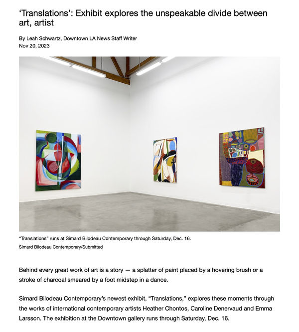 HEATHER CHONTOS, CAROLINE DENERVAUD, EMMA LARSSON 4 Nov 2023 - 30 Mar 2024Simard Bilodeau is thrilled to present Translations , a trio exhibition featuring works by women artists: Heather Chontos (America - Portugal), Caroline Denervaud (Switzerland - France), Emma Larsson (Sweden) ....Read more -